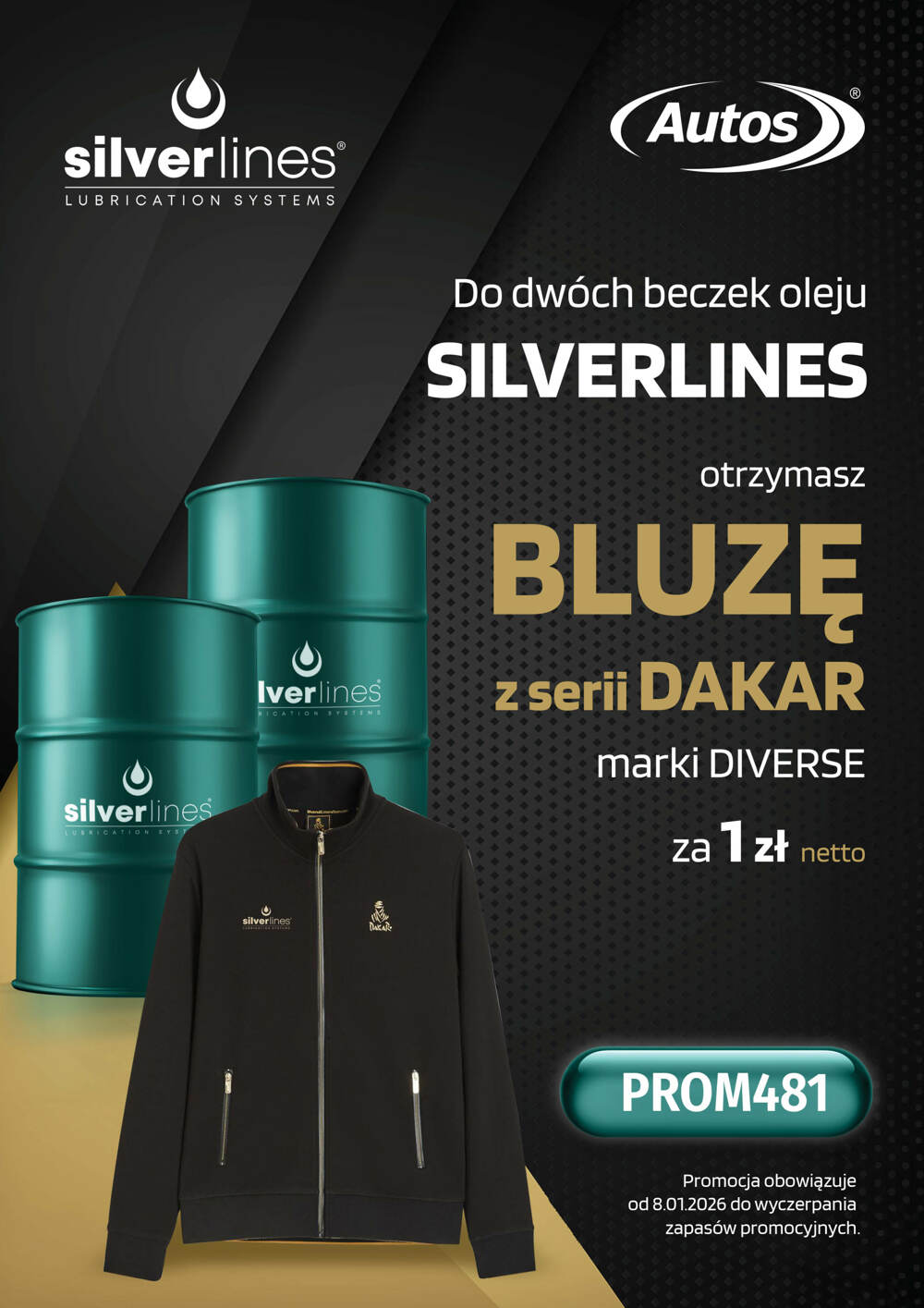 Do zakupu 2 beczek dowolnego oleju marki Silverlines, otrzymasz wyjątkową bluzę Diverse z serii Dakar za 1 zł netto