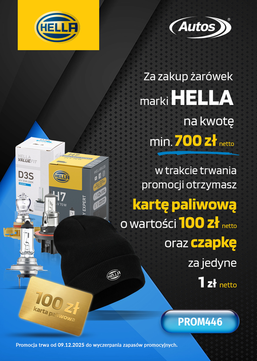 Jeżeli kupisz żarówki marki Hella za kwotę 700 zł netto w trakcie trwania promocji, to otrzymasz kartę paliwową o wartości 100 zł netto oraz czapkę zimową za jedyne 1 zł netto.