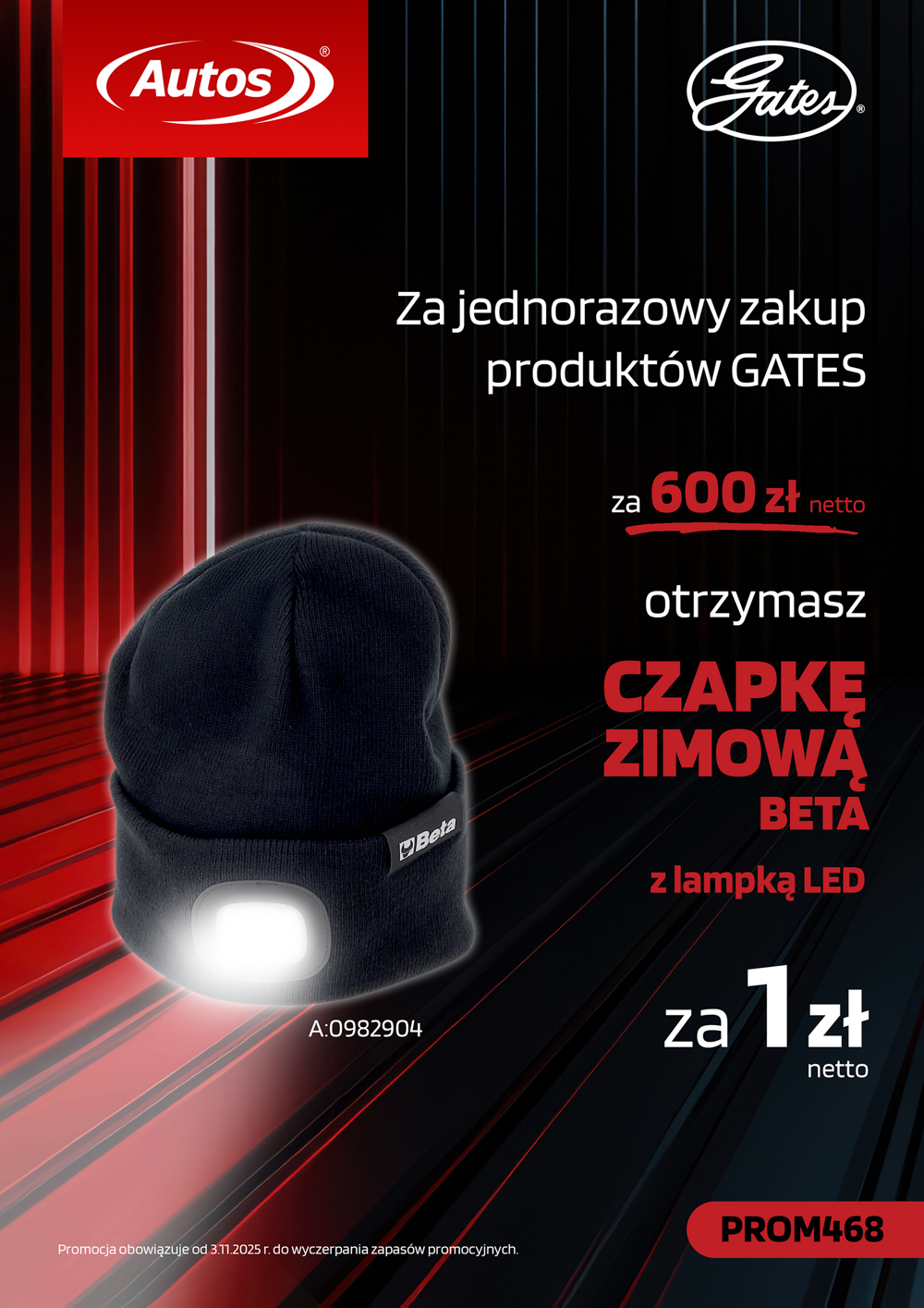 Za jednorazowy zakup produktów Gates na kwotę 600 zł netto czapka z lampką LED za 1 zł netto.
