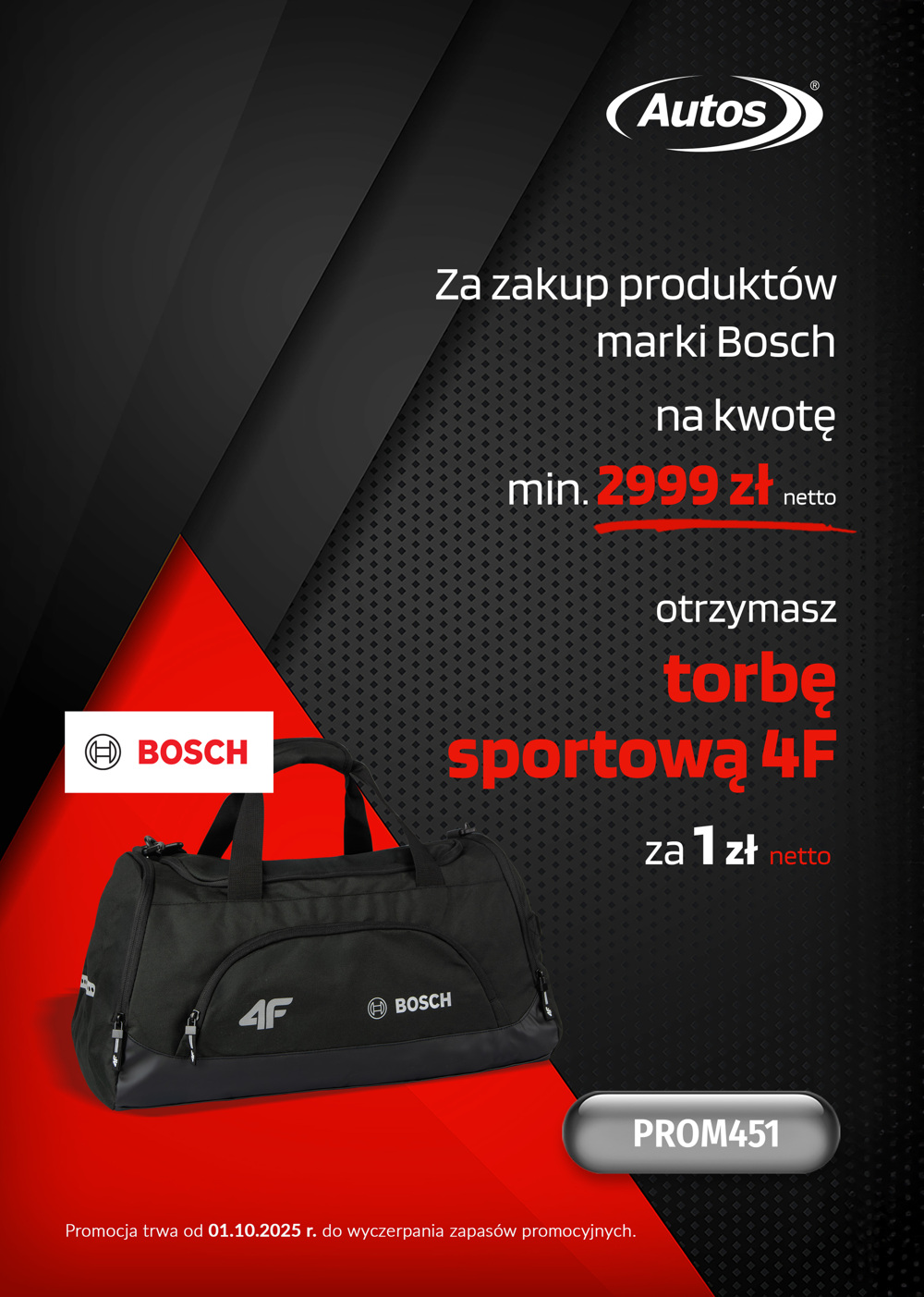 Za jednorazowy zakup produktów marki Bosch za kwotę 2999 zł netto otrzymasz torbę 4 F za 1 zł netto.