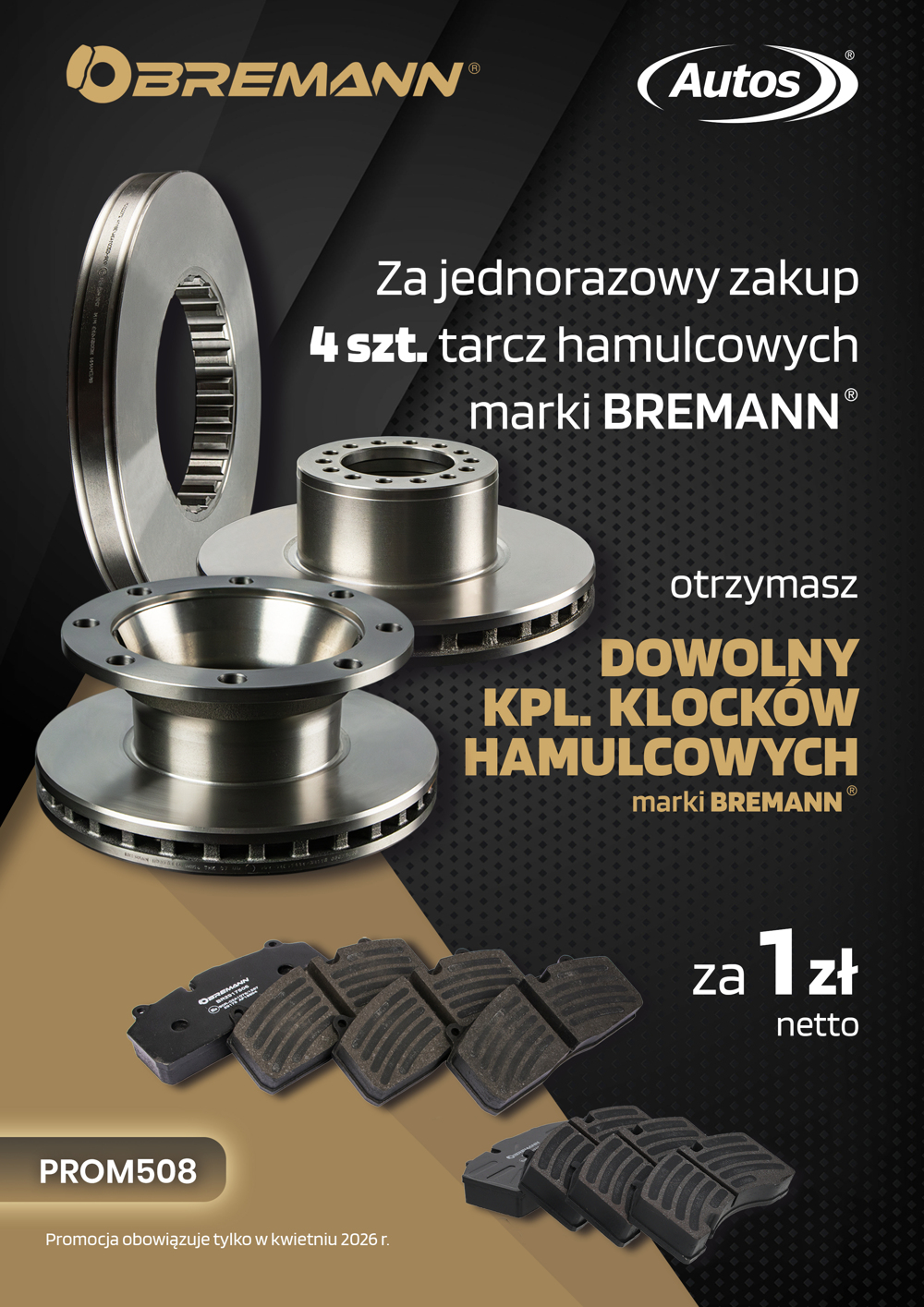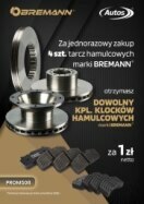 Za jednorazowy zakup 4 tarcz hamulcowych marki Bremann otrzymasz komplet klocków hamulcowych za 1 zł netto.