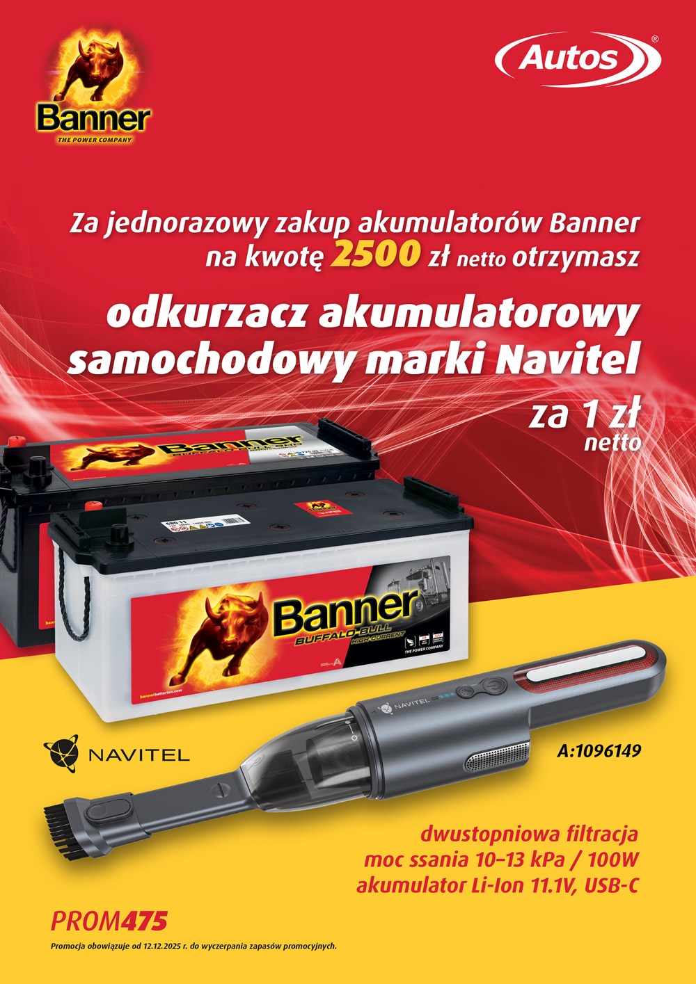 Za jednorazowy zakup akumulatorów marki Banner na kwotę 2500 zł netto otrzymasz odkurzacz akumulatorowy samochodowy marki Navitel za 1 zł netto.